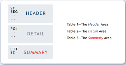 Many transaction sets have three parts. The segments that may be used in each of these parts, within a specific document (i.e., invoice), are specified in associated tables defined in the X12 Standards document. For example: